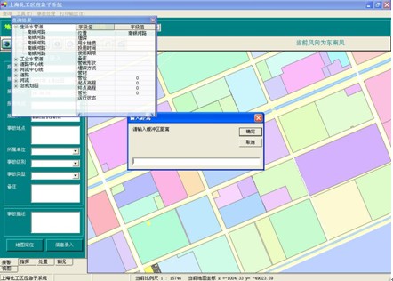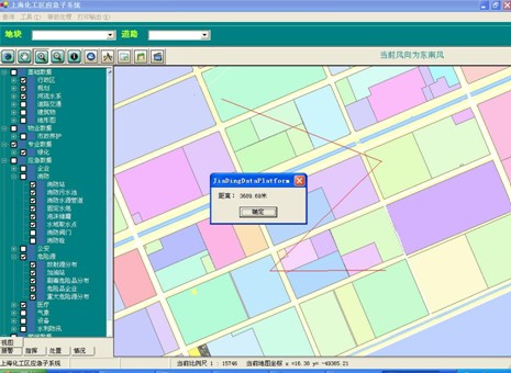 1 影响范围分析:以当前事故点为中心,根据功能窗口上的“紧急隔离半径”和“下风向防备距离”在地图上生成影响范围效果图,红圈表示紧急隔离范围,蓝圈表示防备距离,根据风向的设置,以黄框表示的防备区也将不断进行变化。可通过功能窗口上的信息显示按钮,分别查询三个区域中所有的被影响单位的信息。