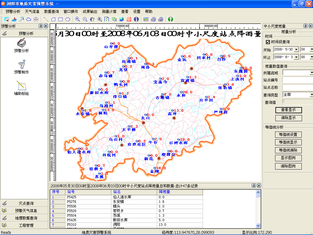实现对中小尺度雨量的实时查询、历史查询,在地图上以数值点形式展示,在表格中查看详细信息,还可以快速生成等值图。